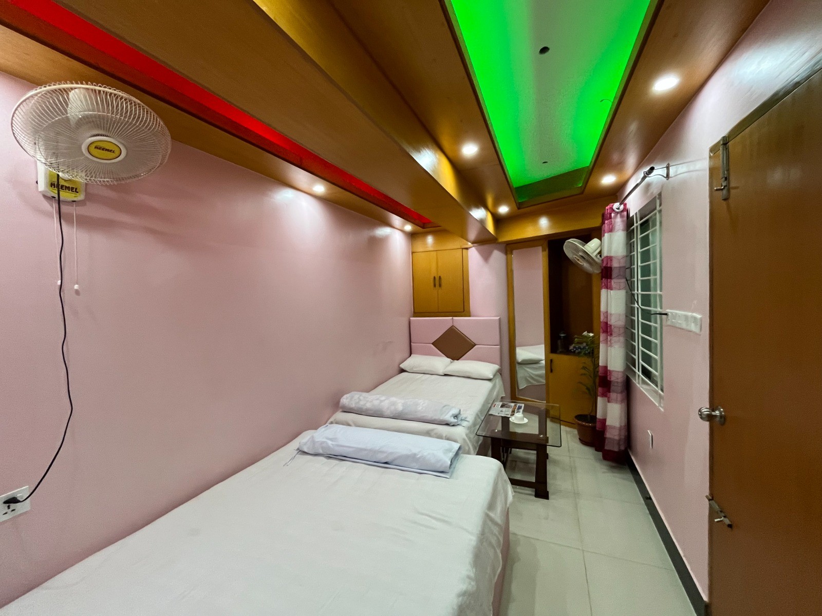 Standard non-AC room with two beds, free Wi-Fi, and attached bathroom. Includes soap, shampoo, tissue, and towels. Suitable for up to three guests.